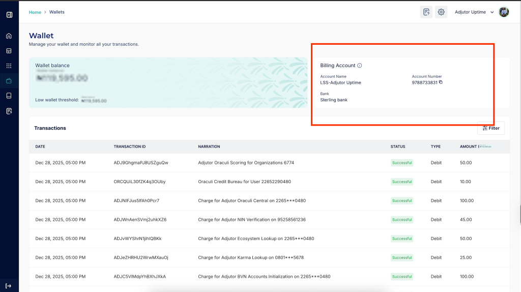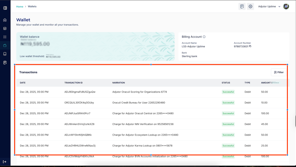 Adjutor provides a variety of priced API endpoints, and charges are deducted automatically from your service wallet upon successful usage. You can review all wallet activities in the Transactions section on the Wallet page, including timestamps, amounts, and the specific endpoints accessed for clear financial tracking.