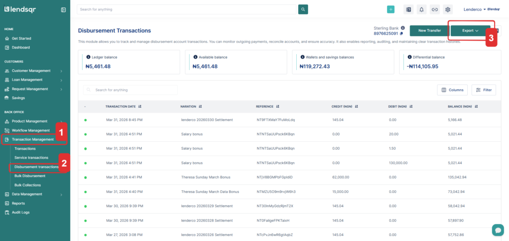 One of the key transaction statements available is the Disbursement Transaction Statement. The disbursement transaction page is the hub for all loan disbursement and repayment transactions. Once a lender signs up on Lendsqr, a disbursement account is automatically set up for them. This account manages all their loan-related inflows and outflows, including disbursements.