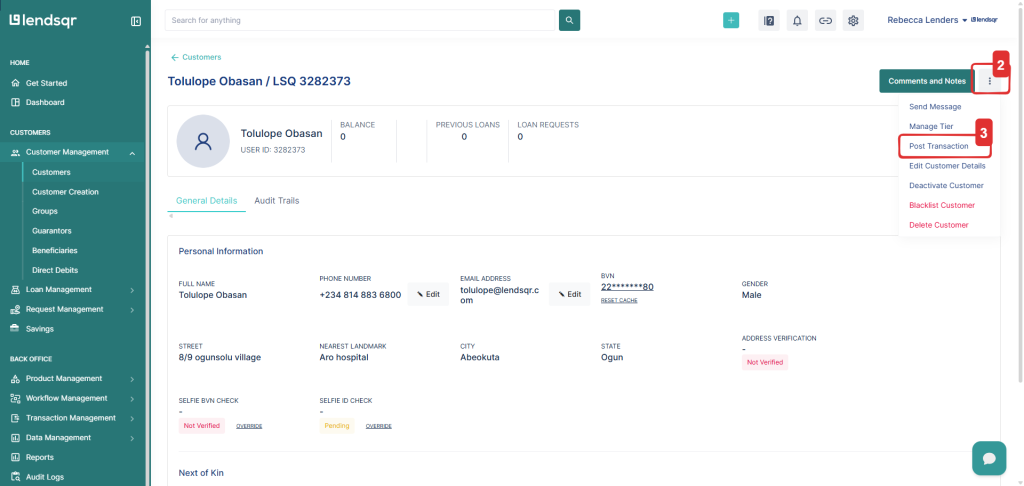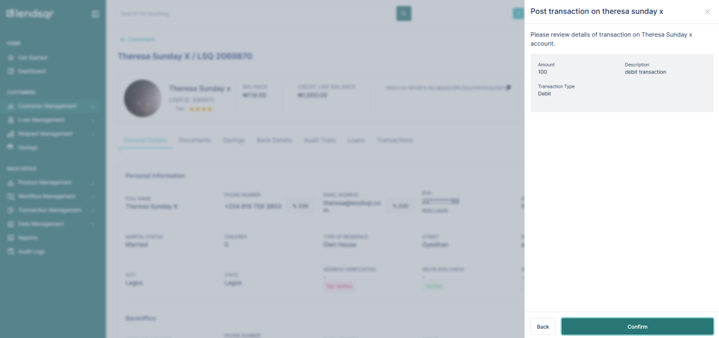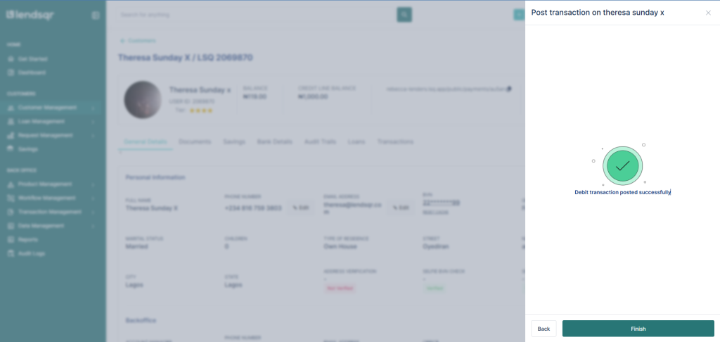 Lendsqr allows authorized admins and lenders to manually credit or debit user wallets directly from the admin console. This enables efficient management of wallet balances without needing external systems.