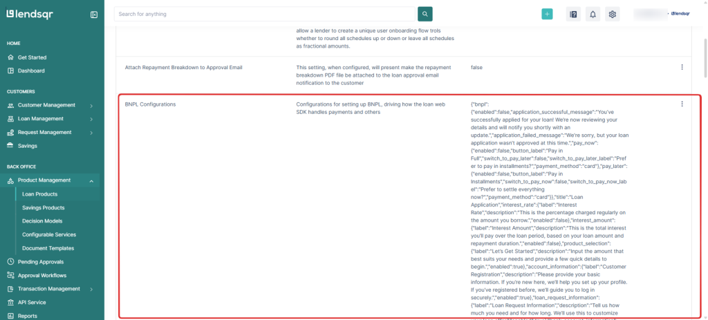 The configuration below defines how Buy Now, Pay Later (BNPL) works within the Lendsqr platform. Each section of the JSON enables or disables specific steps, labels, and flows in the BNPL journey.