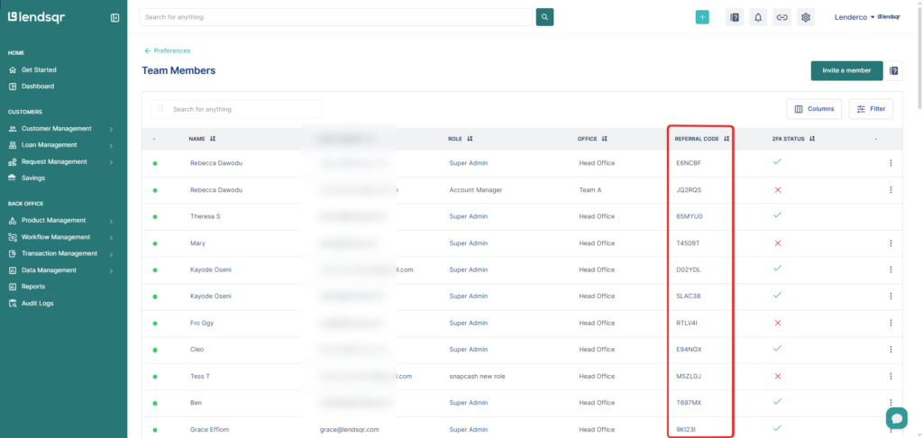 - The resulting page shows the list of team members and their referral codes