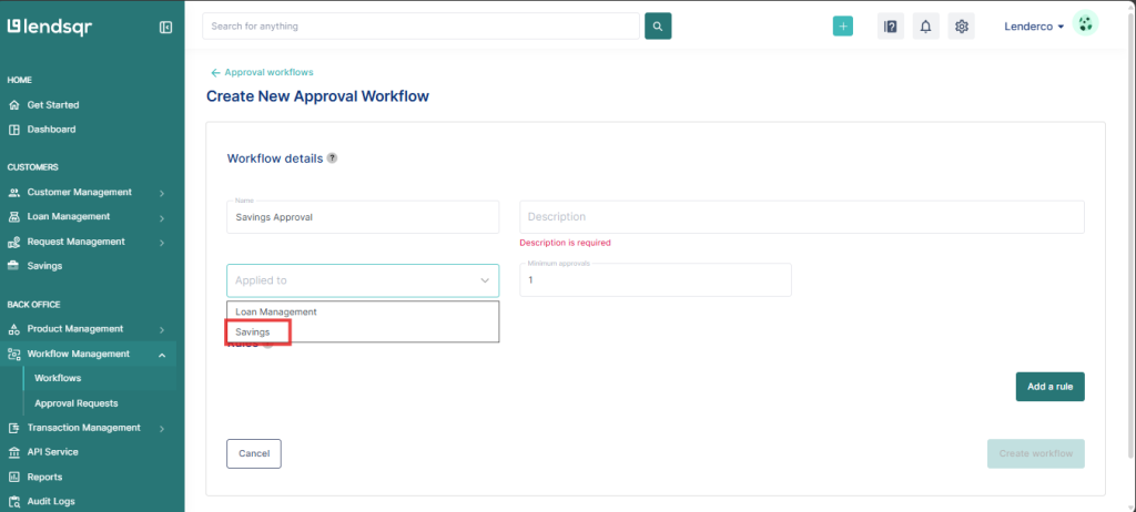 Once saved, the approval workflow will automatically apply whenever a withdrawal is initiated from that savings product.