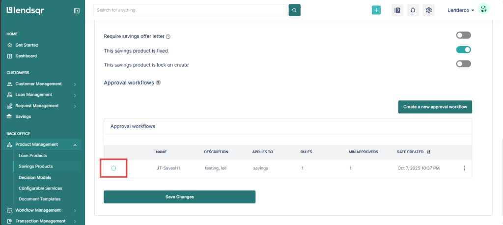- To add an approval workflow to an existing product, click on the savings product from the list.