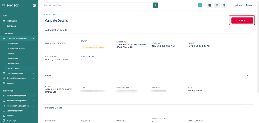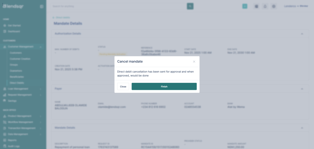 - If approved: the system proceeds to cancel the mandate.