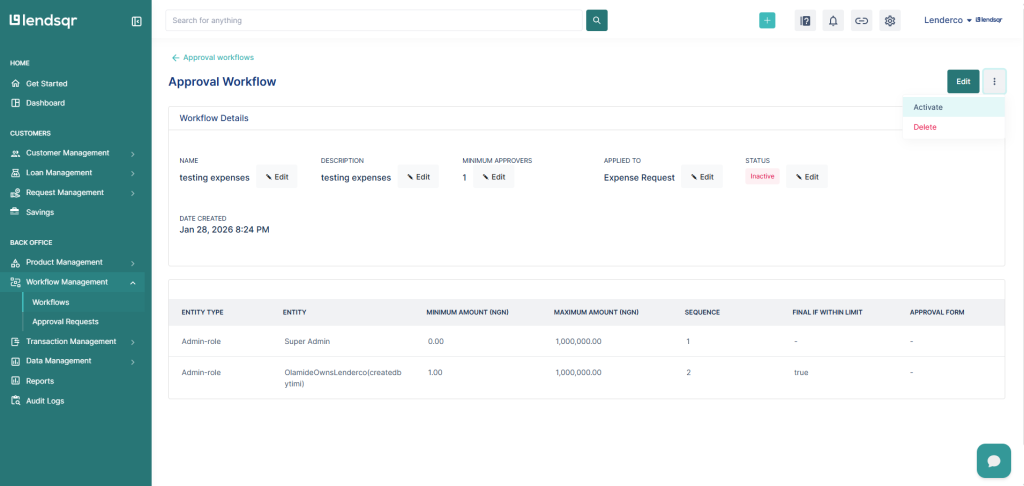 - Applied To: Select the entity (e.g., Loan management) this workflow will apply to.