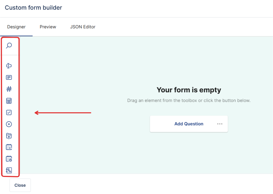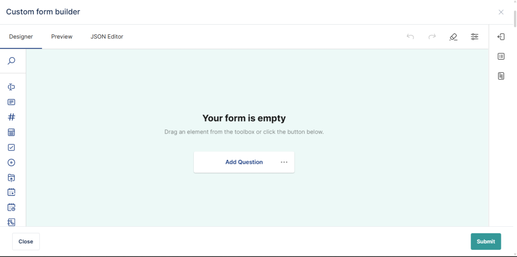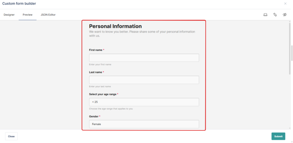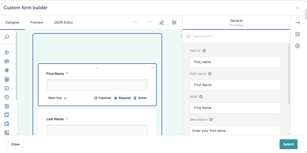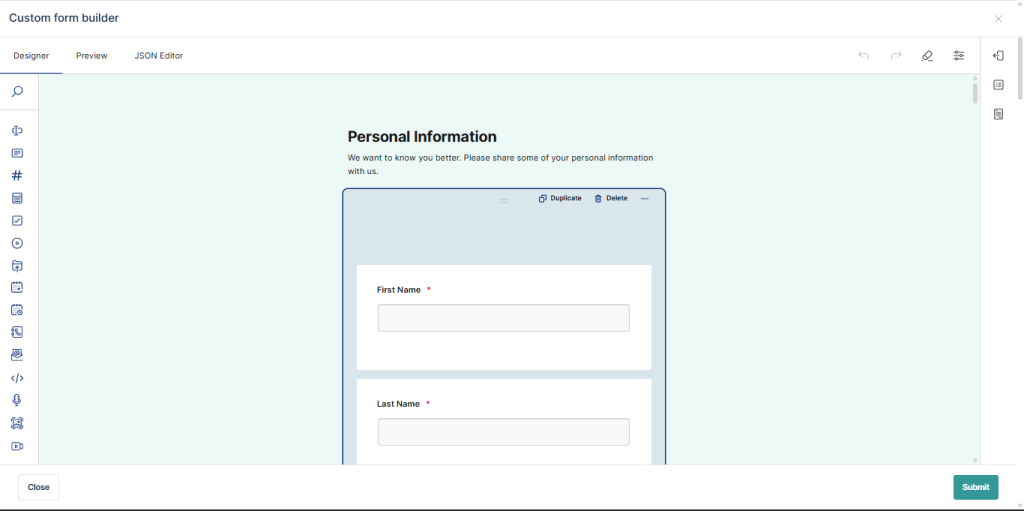 The Drag-and-Drop Form Builder is a visual tool that lets you design forms by selecting fields and placing them onto a canvas. Instead of manually writing JSON or configuring fields in code, you can: