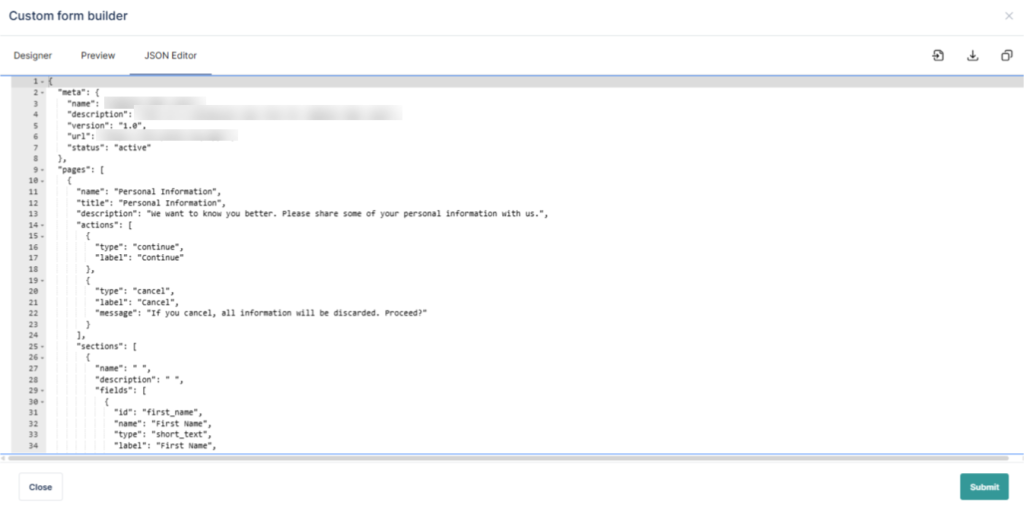 The JSON Editor is designed for advanced users who want direct access to the underlying form definition.