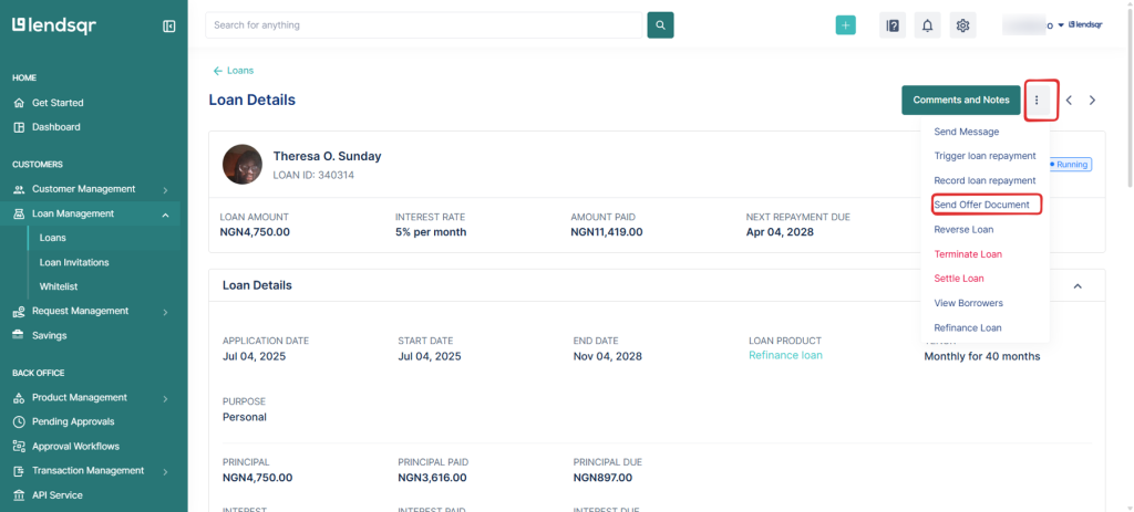 - From the loan details page, click “Send Offer Letter” from the menu.