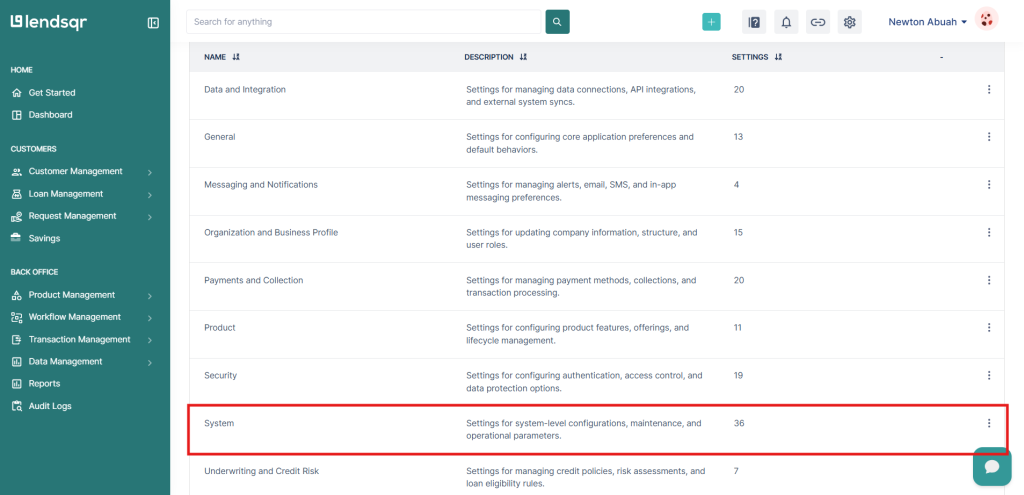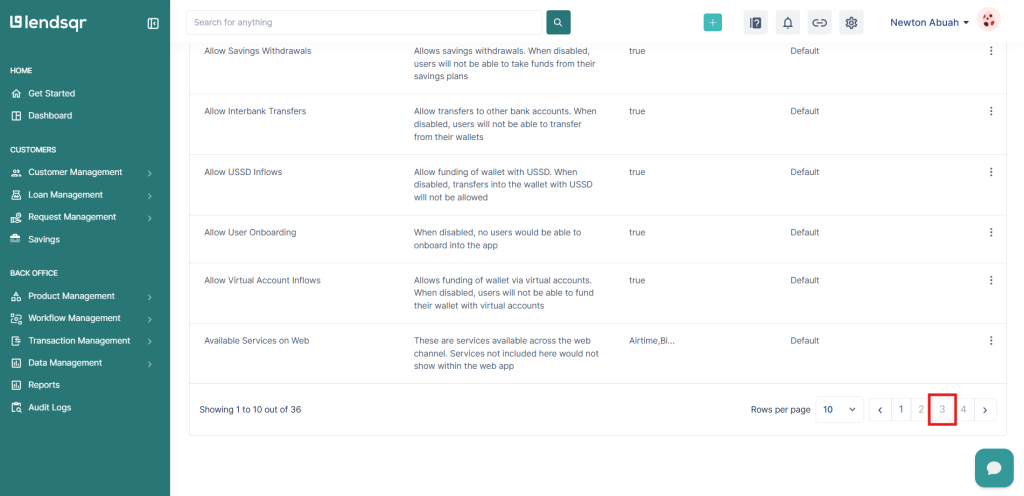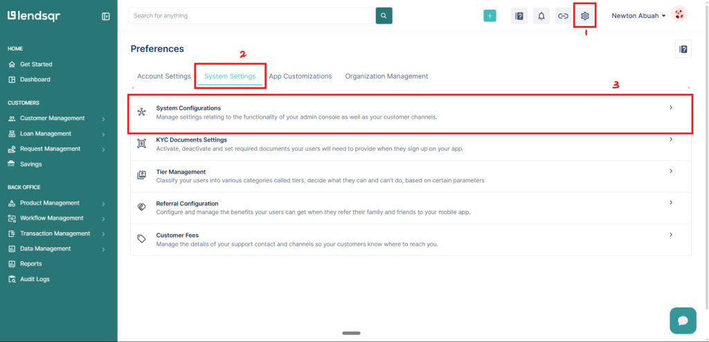 - Login to the Lendsqr Admin Console and click on the settings icon