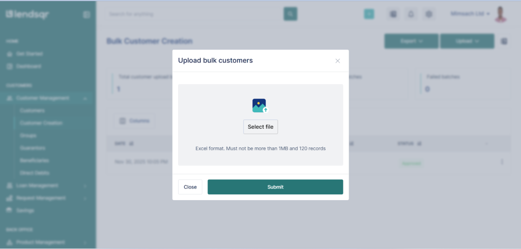 Bulk customer onboarding allows lenders to create multiple customer profiles at once by uploading a single file. Instead of entering each customer manually, you can prepare an xlsx file and upload it to the platform, saving time and ensuring consistent, error-free data entry.