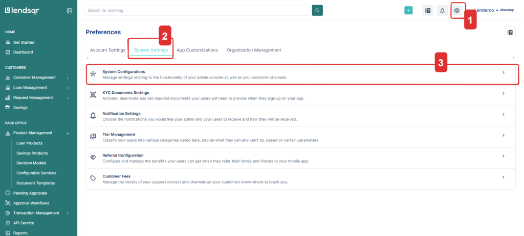 1. Log into your Lendsqr admin console and navigate to Preferences by clicking on the Settings Icon.