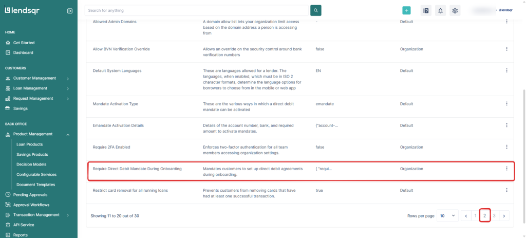 5. Scroll down on the resulting page and click on 2 on the table pagination to locate the setting labeled Require Direct Debit Mandate During Onboarding.