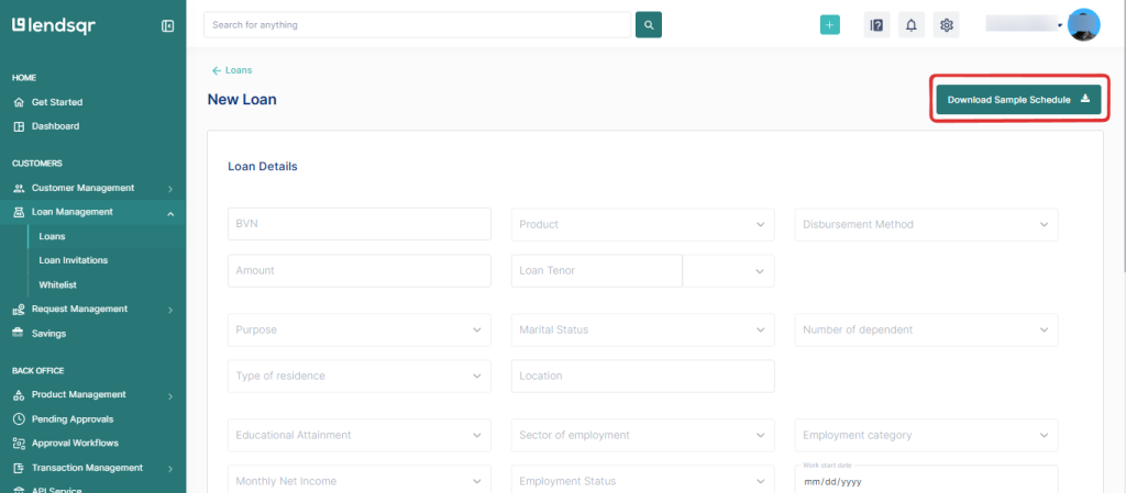 3. On the Book New Loan page, click on ‘Download Sample Schedule’ to get the template.
