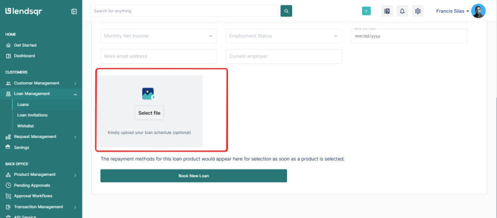 To upload a custom schedule while booking a loan, follow the steps below: