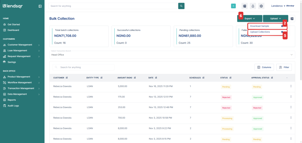 Bulk collections give you a fast and efficient way to recover multiple loan or savings repayments at once. Instead of initiating collections one customer at a time, you can upload a single file containing all the entities that are due for repayment. The system automatically processes each collection, reducing manual effort, improving accuracy, and helping your team stay on top of repayment schedules. This feature is especially useful for lenders or organizations that manage high transaction volumes and want a seamless, automated way to collect from their users.