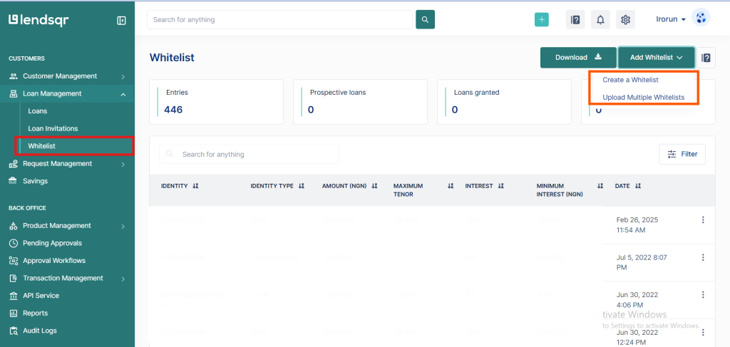 By using Lendsqr’s Whitelist Prequalification, lenders can streamline loan approvals for trusted customers while maintaining a clear audit trail of all whitelisting actions.