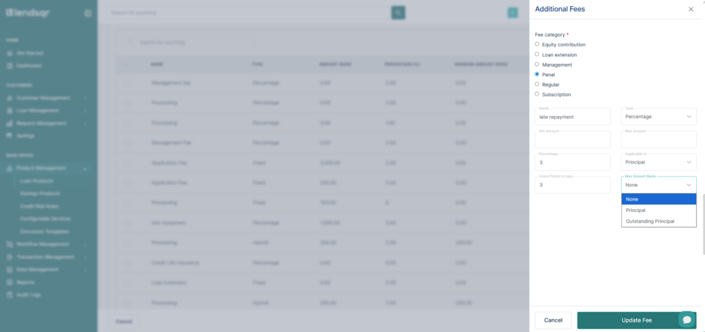 After clicking edit, you will see the detailed configuration for that penalty fee. You can now update any of the penalty parameters, including the amount, percentage, applicable setting, minimum amount, maximum amount, grace period, frequency, or max amount basis. Make the necessary changes to reflect the correct penalty structure. Review your changes carefully to ensure accuracy. Once you are satisfied with the updates, click “Update Fee” to save and effect the changes. The system will process your modifications and apply them to the loan product.