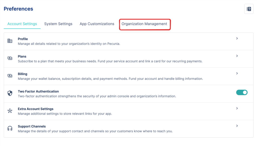 2. Select the Organization Management tab to access your company’s structural configurations..