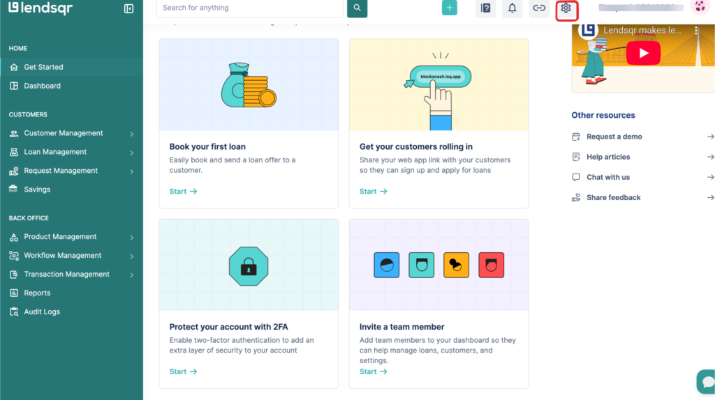 1. Navigate to Settings via the gear icon at the top right of your dashboard.