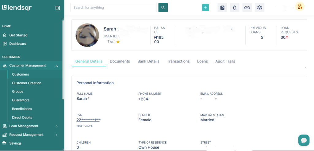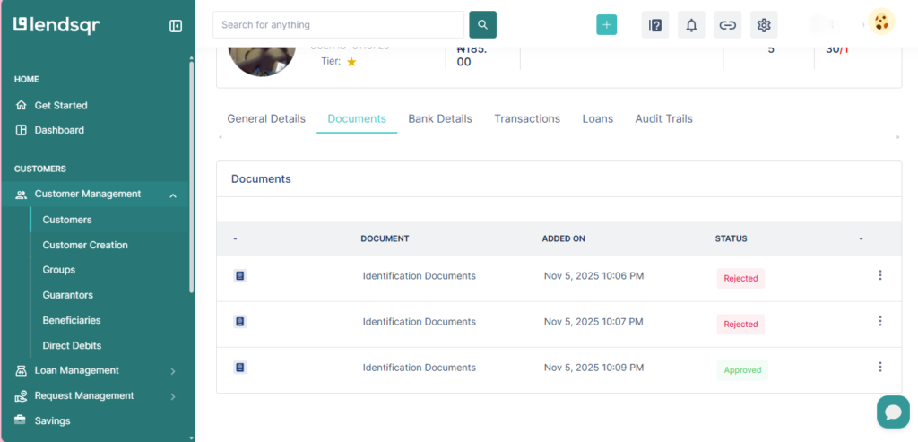 - Step 3: The profile is split into six tabs which include the customer’s General details, Documents, Bank details, Transactions, Loans, and Audit trail. The General details tab shows the customer’s full name, phone number, and their tier level, which is represented by stars (e.g. three stars = Tier 3). The Documents tab lists each submitted document alongside its status, which is either approved or rejected.