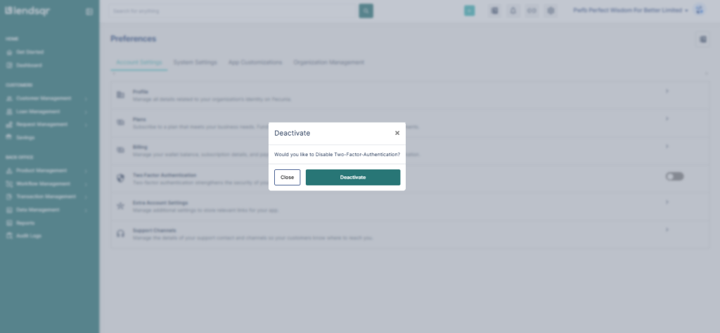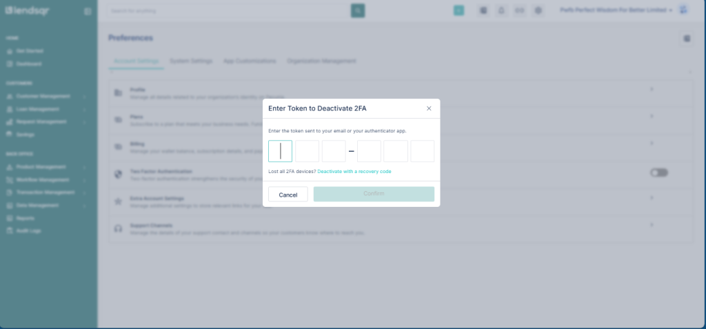 A Two-Factor Recovery Code, also called a backup code, is generated when you first set up Two-Factor Authentication (2FA) on your Lendsqr admin account. These codes act as a backup login method. You can use them if you lose access to your Authenticator app or phone.