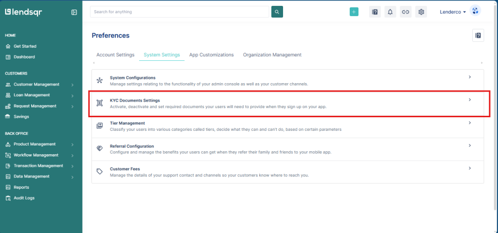 This section allows platform administrators to control the specific documents required from borrowers during onboarding or throughout the lending lifecycle.