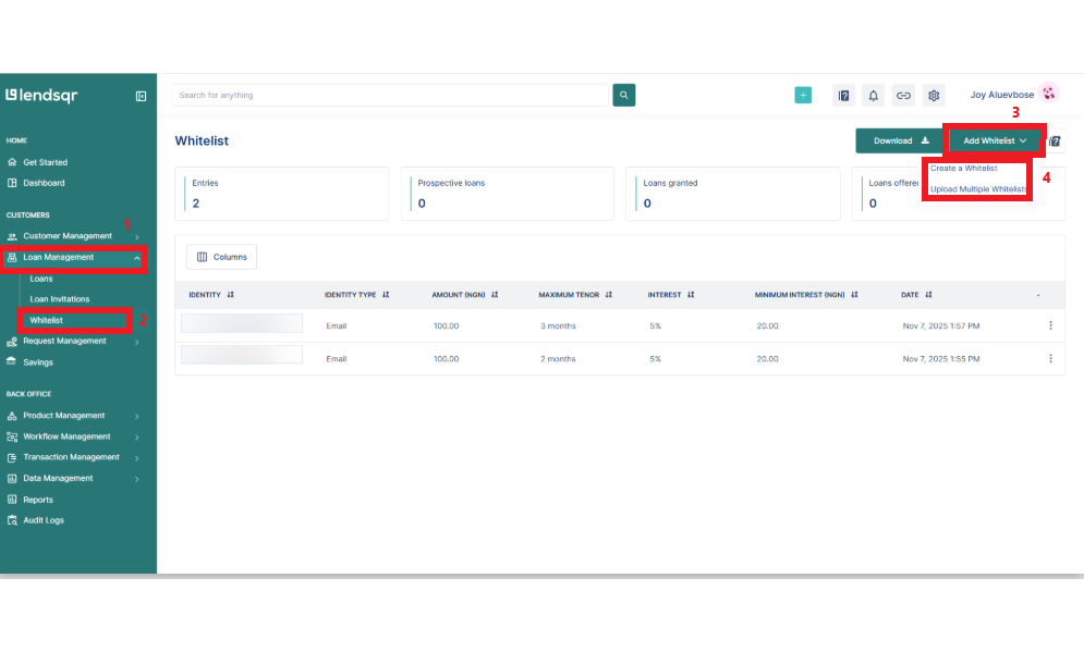 - Navigate to the “Whitelist” sub-tab under the “Loan management” tab.