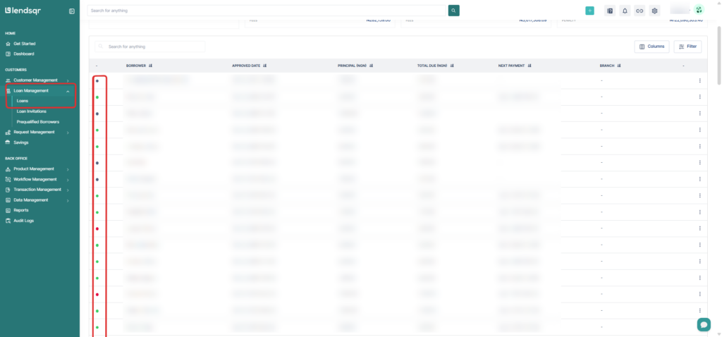- Colored status indicator (first column on the left) shows loan state: