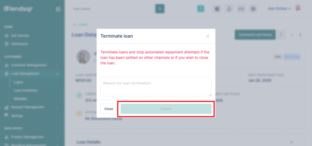 You can also use this feature when a user has repaid almost the entire loan but has only a very small balance left. In this case, an admin may choose to close the loan by updating its status to Terminated.