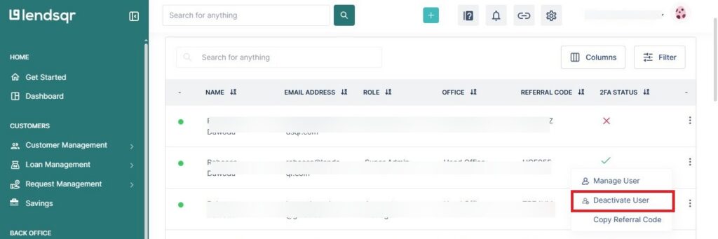 - Activate or deactivate access: If a team member is temporarily away, you can deactivate their access without deleting their account as shown below.